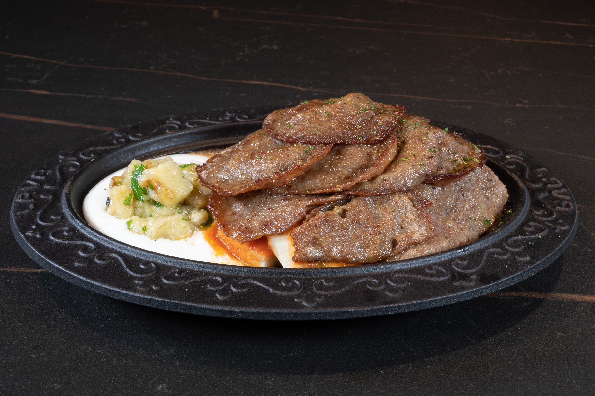 Handmade Meatball Slices on Pita, Buveno Kebab Sauce, Yogurt , Eggplant Paste, Butter